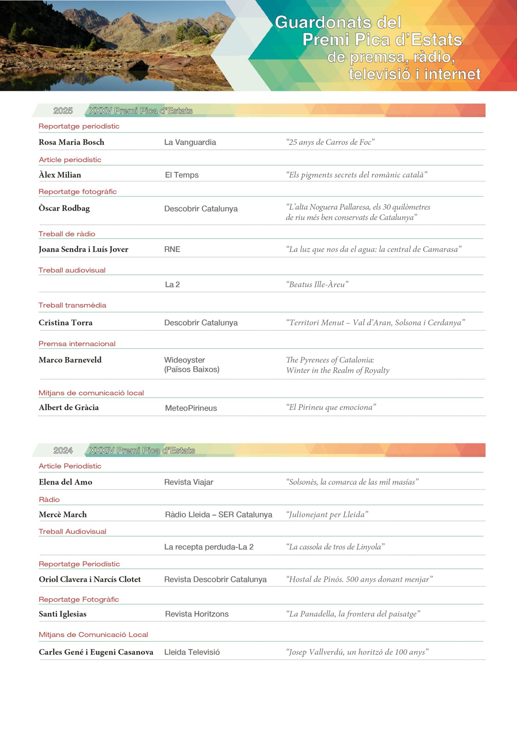 El Premi Turístic Internacional Pica d’Estats ha celebrat 35 edicions des de la seva creació, consolidant-se com un referent en el reconeixement al periodisme turístic. Amb el temps, ha ampliat les seves categories, incorporant formats com el transmèdia i la premsa internacional. Cada edició destaca per l’alta qualitat dels treballs i per la diversitat de mitjans participants. La dotació econòmica i el prestigi del guardó han anat creixent amb els anys.